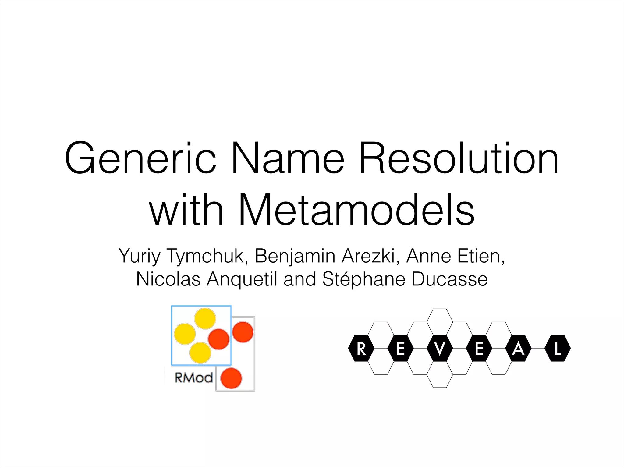 This document discusses using metamodels to resolve symbols in source code. It describes building metamodels of programming languages like Smalltalk and Java that represent concepts like classes, methods, and packages. These metamodels allow resolving symbols by looking them up in different scopes like method, class, package scopes. Case studies are presented on applying this technique to resolve symbols in languages like Smalltalk, Java and Cobol.