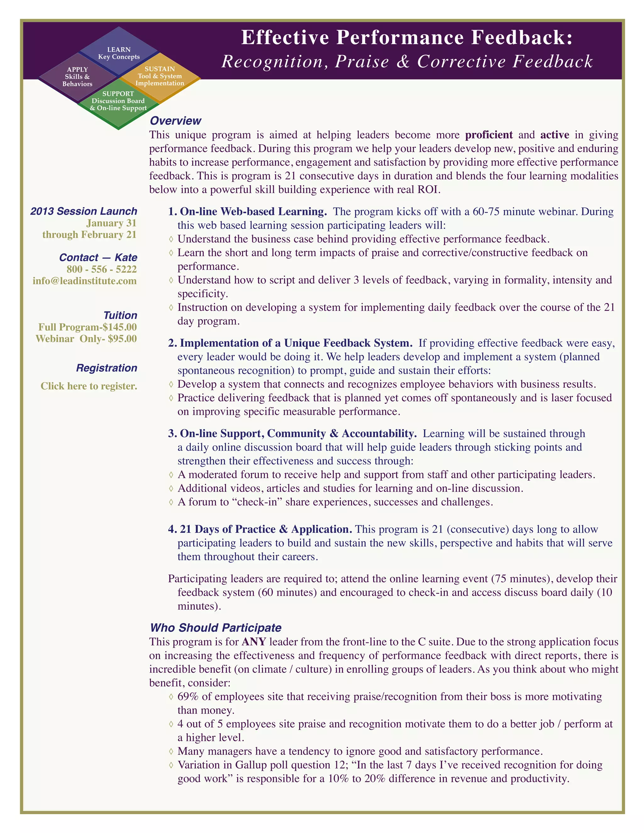 The document outlines a 21-day program designed for leaders to enhance their performance feedback skills through a mix of online learning, community support, and practical application. Participants will develop effective feedback systems and gain insights into the positive impacts of recognition and constructive criticism on employee performance and engagement. The program is suitable for leaders at all levels and emphasizes the importance of consistent feedback for improving workplace culture and productivity.