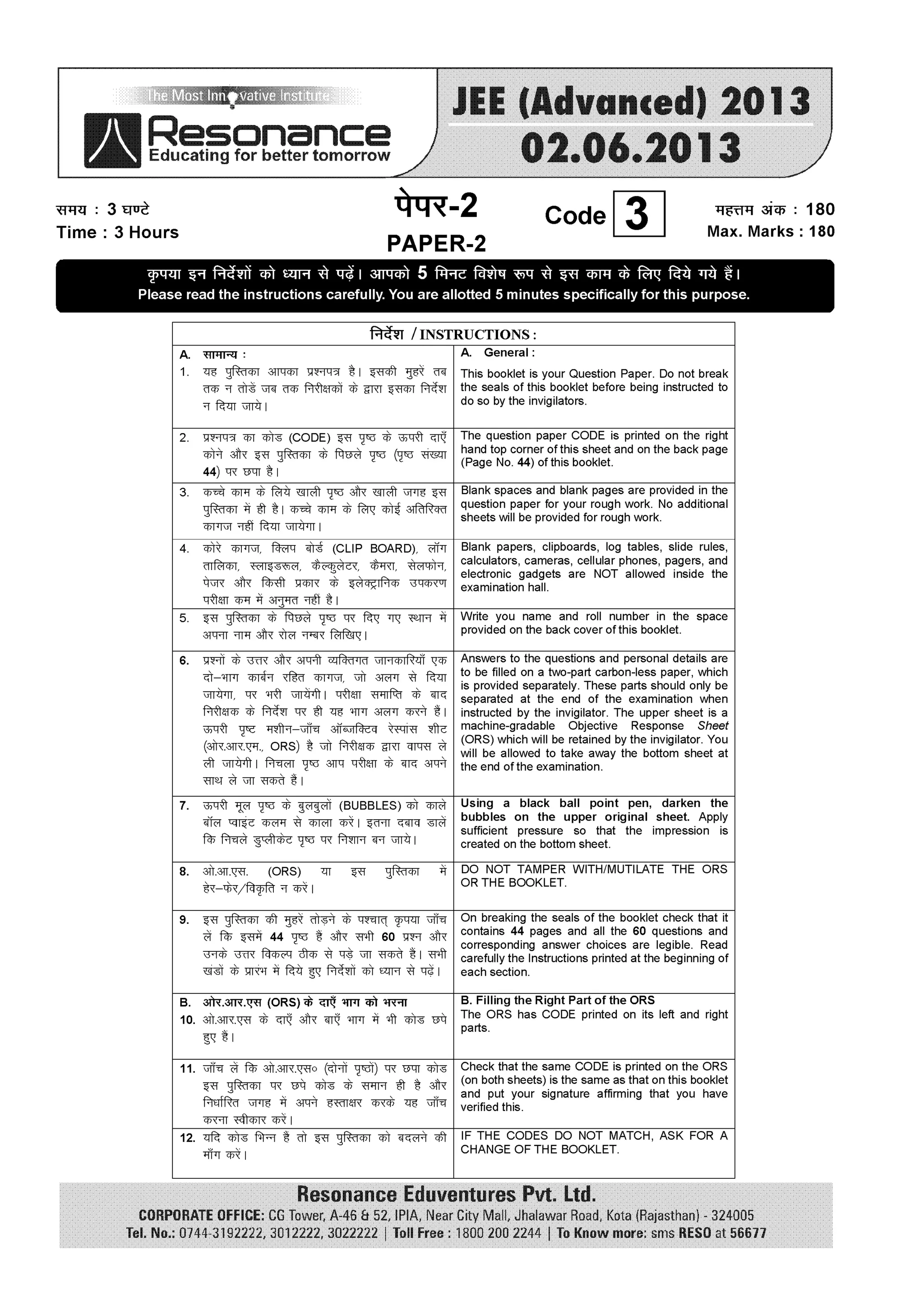 Resonance JEE Advanced Paper 2-solutions