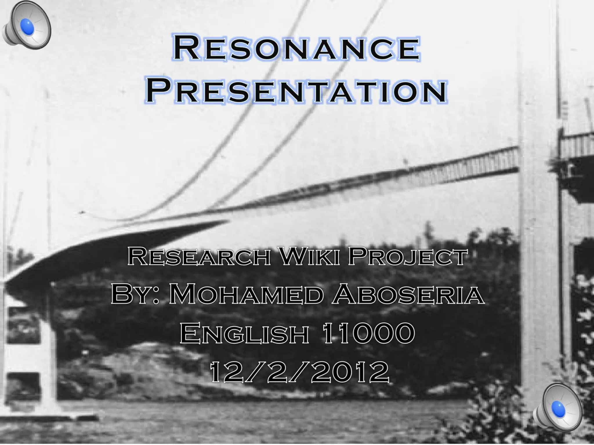 The document discusses the concept of resonance through examples such as bridges and mechanical systems. It explains that resonance occurs when an object vibrates at greater amplitudes due to another source emitting its natural frequency. Specifically, it discusses how the Tacoma Narrows Bridge collapsed in 1940 due to wind-induced oscillations resonating with the structure of the bridge. It also summarizes the collapse of the Nimitz Freeway in 1989, which was caused by an earthquake matching the bridge's resonant frequency. The document provides background on concepts like kinetic energy, potential energy, amplitude, and frequency to explain the physics of resonance.
