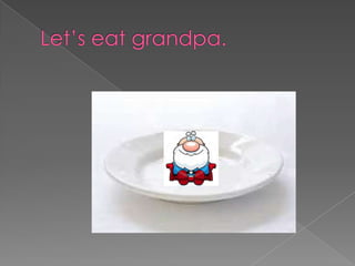 The document presents two sentences with different meanings due to punctuation. The first sentence "Let's eat grandpa" could be interpreted as eating one's grandfather due to the lack of a comma. The second sentence "Let's eat, grandpa" uses a comma to change the meaning to eating and addressing one's grandfather.