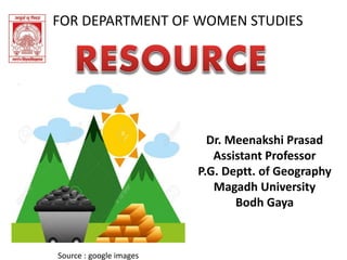 This document discusses resources from a geographic perspective. It begins by defining resources as biotic and abiotic substances that satisfy human needs and desires. It then provides definitions of resources from various scholars that emphasize resources are things in the environment that are useful to humans. The document discusses how factors like culture, technology, economics influence how societies perceive, value and utilize resources. It introduces concepts like resources, resistances and neutral stuff to categorize elements of the environment. Finally, it explains how scarcity, both absolute and relative, affects the economic valuation of resources.