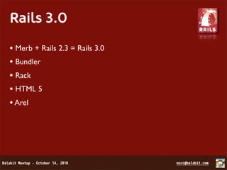 The document provides information about Rails 3.0 including that it combines Merb and Rails 2.3. It discusses features like Bundler, Rack, HTML5, and Arel. It also covers REST, using resources, and responding to different formats. Views, layouts, partials, helpers, caching and expiration are described.
