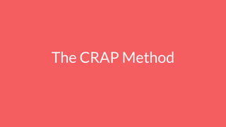 The CRAP method evaluates sources based on currency, reliability, authority, and perspective. It examines when a source was published, whether it can be trusted based on formatting, citations, and alignment with existing knowledge, the author's credentials and affiliations, and the author's angle and potential biases. The method helps assess the quality and usefulness of sources for research.