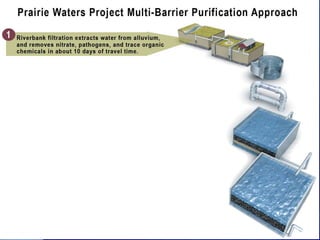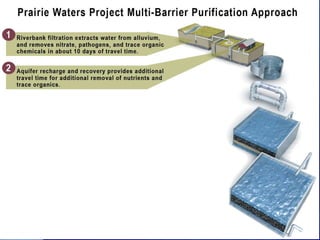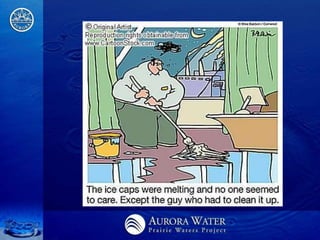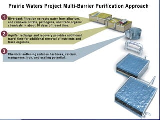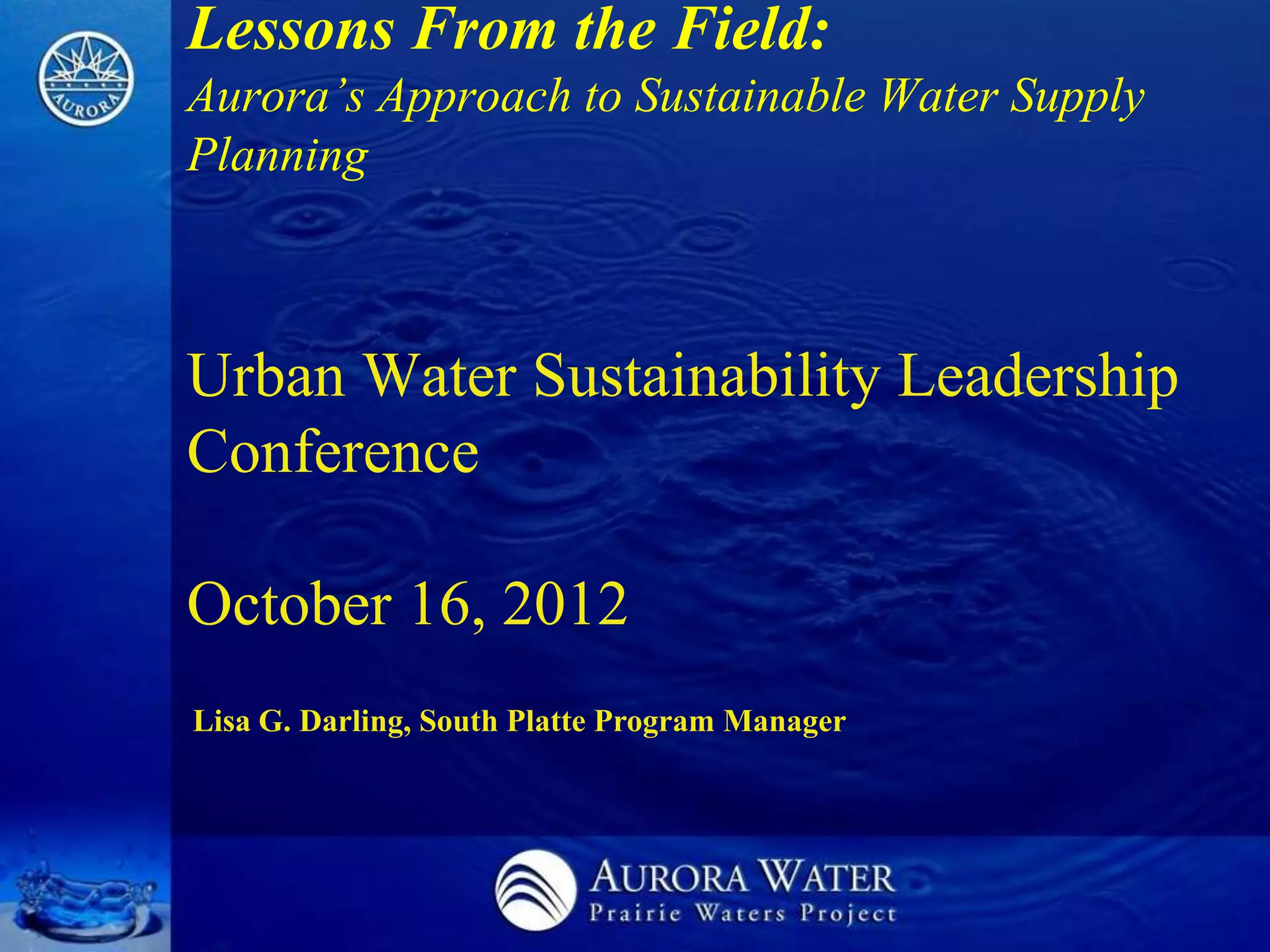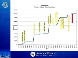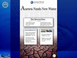 The document outlines Aurora, Colorado's comprehensive integrated resource planning for sustainable water supply, detailing its history, challenges faced during the 2002 water supply crisis, and the selected Prairie Waters Project designed to improve water management. It emphasizes responsible resource usage, environmental benefits, and cost-effectiveness, while also discussing the collaboration among multiple water authorities to enhance regional water supply efficiency. The project showcases a commitment to long-term sustainability through innovative water supply strategies and partnerships.