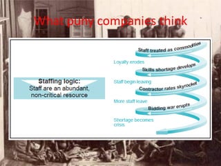 This document discusses outsourcing strategies and considerations for a business unit. It outlines factors that drive companies to outsource, such as costs, quality concerns, IT performance issues, and simplifying management. Important aspects to consider with outsourcing include contract terms, the skills and utilization of resources, performance measurements, costs and benefits, cultural impacts, knowledge management, and effects on business models. Outsourcing is best considered when resource needs outnumber availability, specific skills are required, or it aligns with business strategies around finances, risk management, or company restructuring.