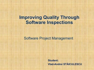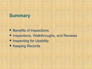 Software inspections improve quality by finding errors earlier, shortening development time and reducing maintenance needs later. Inspections involve an author, moderator, reader, recorder and inspectors reviewing software artifacts like designs or code. Effective inspections of user interfaces involve walking through usage scenarios to simulate interactions. All issues found are recorded in detail so the author can address them. Tracking inspection results helps organizations assess quality and determine the most effective inspection methods.
