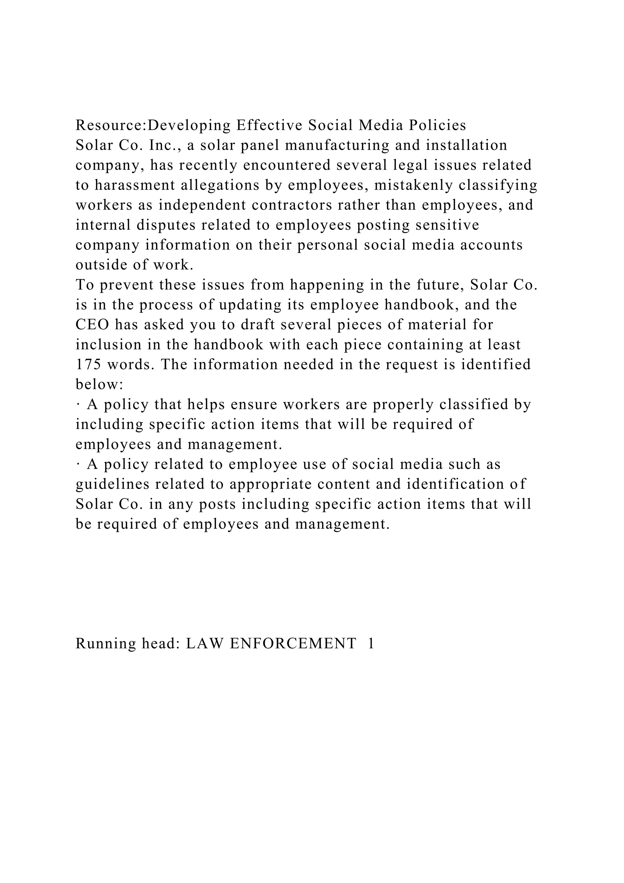 Solar Co. Inc. is updating its employee handbook to address recent legal issues including employee harassment, misclassification of workers, and misuse of social media. New policies will ensure proper classification of workers and establish guidelines for employee social media use to protect sensitive company information. The handbook will contain actionable items for both employees and management to prevent future incidents.