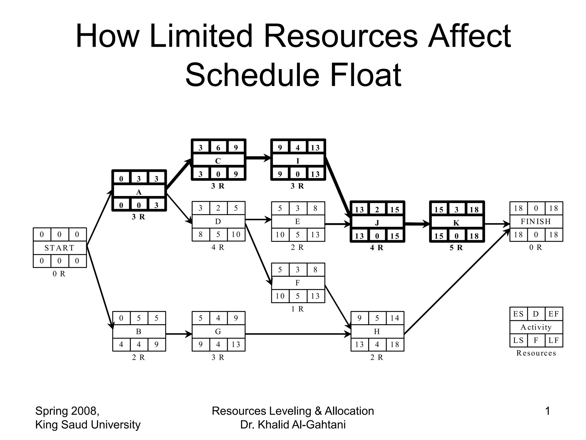 The document describes a resource allocation example using a serial method. It shows a project schedule network diagram with multiple activities (A, B, C, etc.) that require a single critical resource. The serial method allocates the critical resource to activities one at a time without interruption to determine the minimum project duration needed to complete all activities.