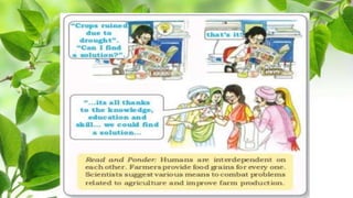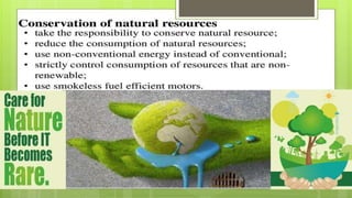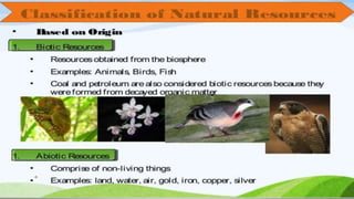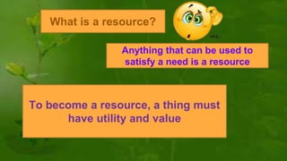 This document discusses different types of resources including natural, human, and human-made resources. It defines a resource as anything that can satisfy a need and has utility and value. Resources can be natural like land, air and water, human like skills and knowledge, or made by humans using natural resources. The document outlines that resources are unequally distributed based on terrain, climate and altitude. It emphasizes that human beings are the most important resource because they generate demand, give utility to other resources, and can develop new resources through ideas, knowledge and technology. The document also discusses renewable vs. non-renewable resources and our duties to conserve resources and environment.