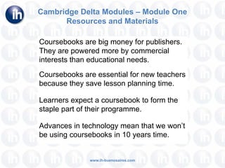 The document discusses various options for handling exercises and materials from course books and resources for Cambridge Delta Modules. It suggests leaving exercises out and moving on, doing exercises briefly, supplementing with other activities, creating original materials, adapting existing materials, and simplifying graded texts by reformulating complex structures, reworking old-fashioned usage, and replacing low-frequency vocabulary.