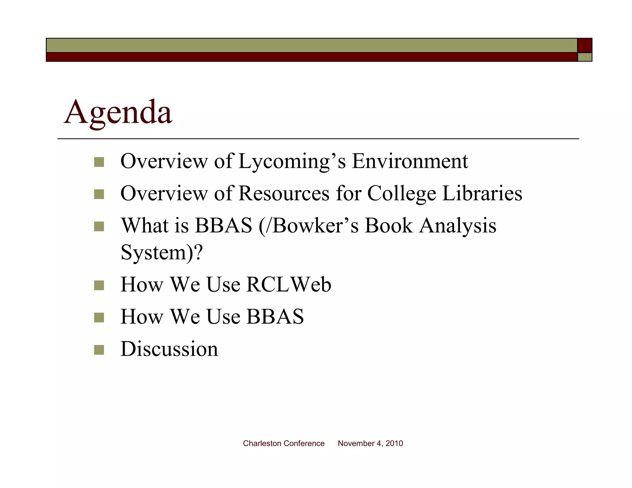 Sue Beidler from Lycoming College discusses how the college uses Resources for College Libraries (RCL) and Bowker's Book Analysis System (BBAS) to analyze its collection. Lycoming has a collection of around 155,000 volumes and uses RCL and BBAS to evaluate gifts, aid in weeding decisions, assess collection strengths/weaknesses by discipline, and track changes in holdings over time. While useful, the analyses can only be compared to the current RCL database and exported statistics cannot be manipulated. Beidler discusses how comparison data from similar size/type libraries could provide additional context for the numbers.