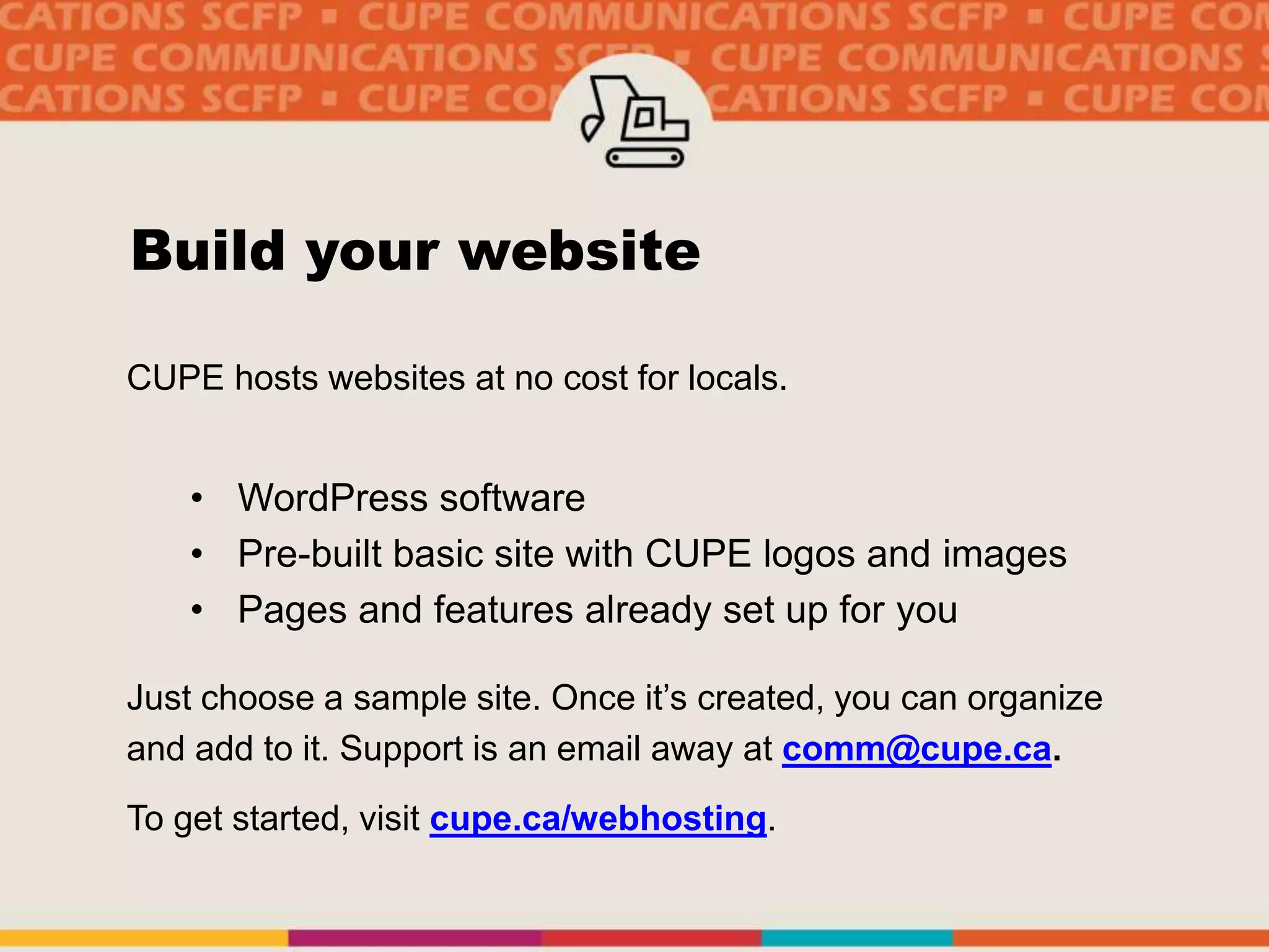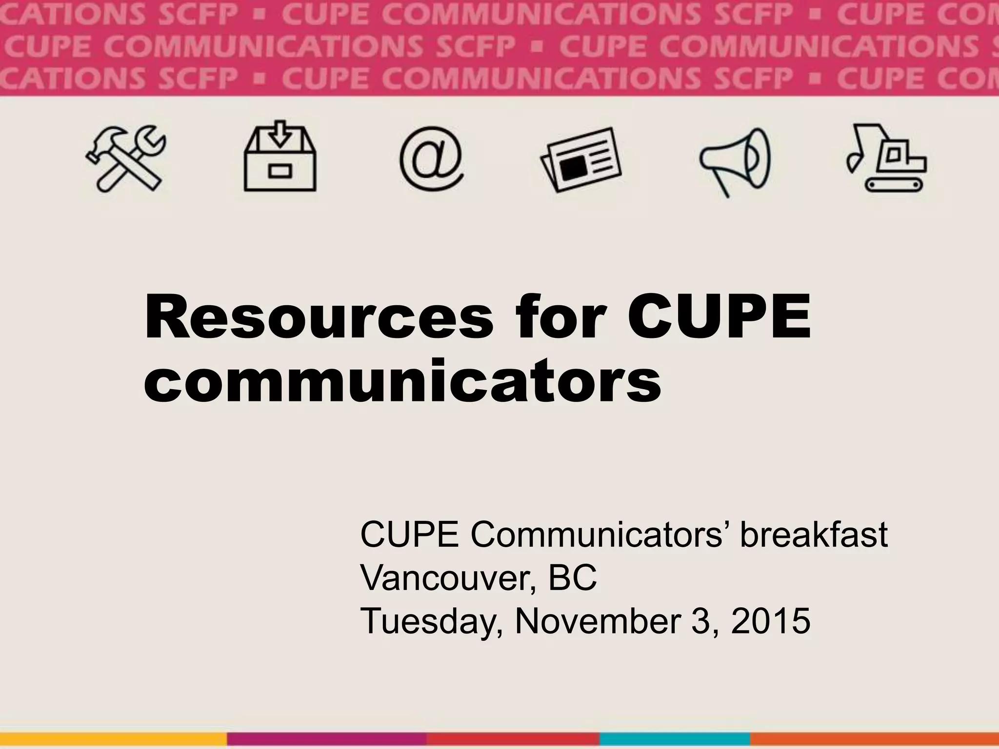 This document provides resources for CUPE communicators, including how to build a website hosted by CUPE at no cost using WordPress templates, create newsletters using CUPE templates, fill website and newsletter pages by subscribing to CUPE news and publications, and send better emails using MailChimp software. It also lists online tools, workshops to develop communication skills, benefits of joining the Canadian Association of Labour Media, and interview opportunities at the CUPE convention.