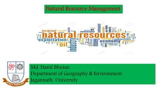 The document discusses natural resources, defining them as substances or materials from the environment that provide economic and technological benefits to people. It categorizes natural resources based on origin (biotic and abiotic), development (potential and actual), availability (inexhaustible and exhaustible), and distribution (national, international, and multi-national). Various types of resources are outlined, emphasizing their significance and classification.