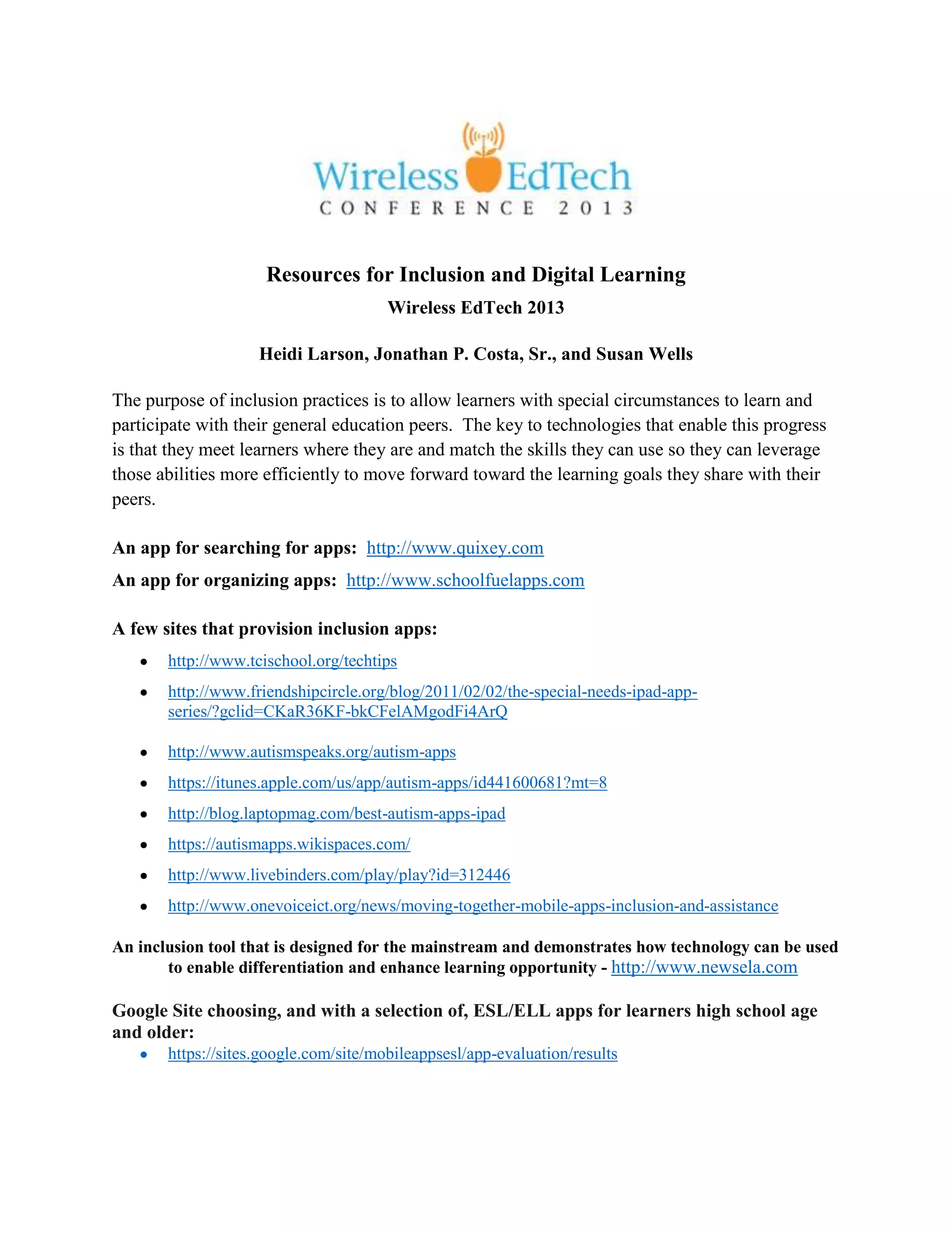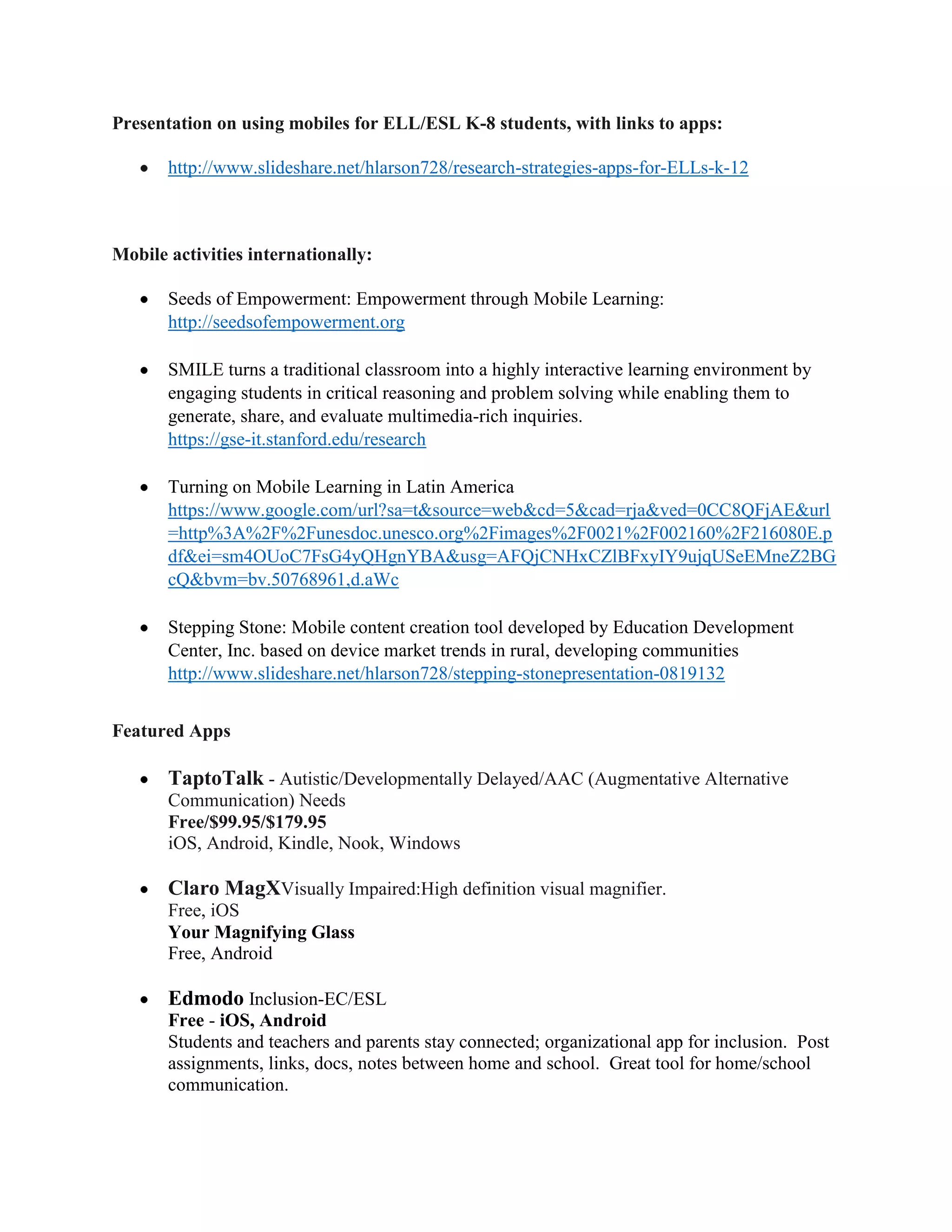 The document discusses resources for promoting inclusion and digital learning. It provides links to apps and websites that can help learners with special needs learn and participate alongside their general education peers by meeting them at their skill level. Examples mentioned include apps for searching, organizing, and provisioning inclusion apps, as well as tools that enable differentiation and enhance learning opportunities for all students. Mobile apps and activities are highlighted that can empower learners internationally through activities like multimedia inquiries and content creation. Featured apps are also listed that address needs like visual impairment, augmentative communication, and inclusion in general education classes.