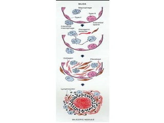 2) Silicosis results from inhaling crystalline silica and presents as nodular lesions in the lungs. High risk jobs include mining, sandblasting, and foundry work.