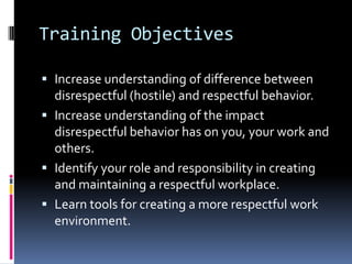 This document discusses creating a respectful workplace environment. It provides training on the difference between disrespectful and respectful behavior, how disrespect impacts individuals and organizations, why some people behave disrespectfully, and tools for addressing inappropriate conduct and building a respectful culture. Specific strategies are outlined for how employees, managers and organizations can respond to issues, have difficult conversations, and problem solve to improve workplace interactions and climate.