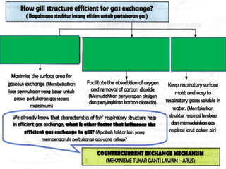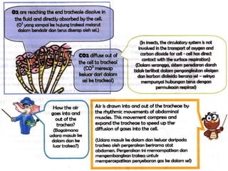 2) Respiratory structures vary between organisms depending on surface area to volume ratio requirements. Insects use a tracheal system of spiracles, tracheae and tracheoles to exchange gases. Humans use a lung system of nostrils, airways and alveoli with inhaling and exhaling breathing mechanisms.