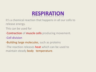 There are two types of respiration: aerobic respiration and anaerobic respiration. Aerobic respiration involves the breakdown of food substances in the presence of oxygen and releases a relatively large amount of energy. Anaerobic respiration involves the breakdown of food substances in the absence of oxygen and releases a relatively small amount of energy. Examples of processes that use anaerobic respiration include muscle activity during exercise and fermentation processes like winemaking, brewing, and baking.