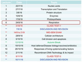 This document contains the schedule and topics for a course on the Science of Living Systems. The course covers topics such as nucleic acids, transcription and translation, protein structure, enzymes, photosynthesis, respiration, cellular architecture, cell division, and recombinant DNA technology. Key concepts around respiration are summarized, including that it converts food energy into ATP through glycolysis, the Krebs cycle, and the electron transport chain in the mitochondria. Fermentation is discussed as an anaerobic pathway that yields less ATP than aerobic respiration. The efficiencies of aerobic and anaerobic respiration are compared. Cellular respiration can break down various biomolecules, and its commercial uses include producing wine, beer and bread.