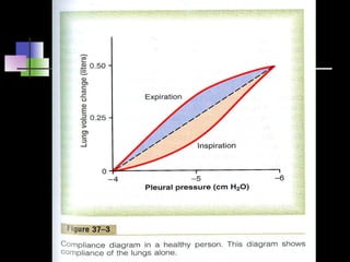 The document discusses the goals and major functional events of respiration, including pulmonary ventilation, diffusion of gases, transport of gases, and regulation of ventilation. It describes the respiratory system and muscles involved in inspiration and expiration. It also covers topics like compliance, surfactant, work of breathing, lung volumes, capacities, factors affecting lung function, and the functions of the respiratory passages.