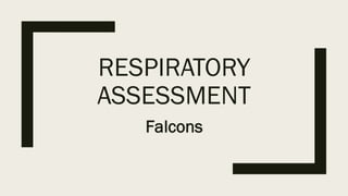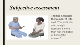 Thomas J. Watson said that asking the right questions is key to finding answers. This document provides guidelines for conducting a respiratory assessment through gathering subjective and objective information. It details questions to ask about symptoms like cough, sputum, dyspnea and wheezing and how to examine vital signs, breathing patterns, chest expansion and auscultated lung sounds. The goal is to collect relevant medical history and evaluate respiratory function and symptoms.