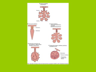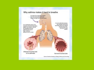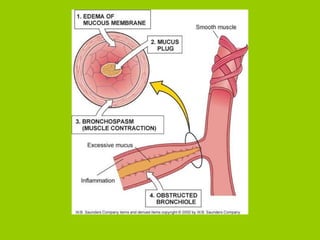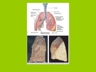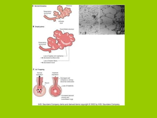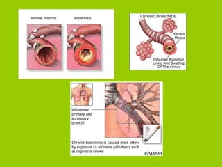 The document provides an overview of respiratory disorders and diseases. It discusses diagnostic tests for respiratory conditions like spirometry and blood gas tests. Common respiratory diseases covered include upper respiratory infections like the common cold, sinusitis, pneumonia, lung cancer, asthma, and chronic obstructive pulmonary disease (COPD). Specific conditions like emphysema and chronic bronchitis are also examined, outlining their pathophysiology, signs and symptoms, diagnosis, and treatment.