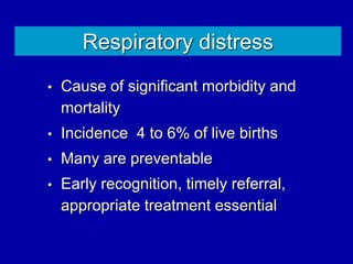 Respiratory distress is a common problem in newborns that can have various causes. It requires early recognition and treatment to prevent morbidity and mortality. The document discusses the causes, clinical presentation, diagnostic evaluation and management of respiratory distress in newborns. Evaluation involves detailed history, physical exam including assessment of respiratory rate, retractions, grunting and cyanosis. Investigations may include chest x-ray, blood gas analysis and sepsis workup. Management is supportive with oxygen therapy, fluid resuscitation and respiratory support as needed. Specific treatments target the underlying condition.