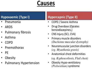This document discusses respiratory failure, including its definition, types, causes, clinical manifestations, diagnostic evaluations, management, and complications. Respiratory failure is when the respiratory system fails to adequately oxygenate the blood or eliminate carbon dioxide. It can be classified as hypoxemic or hypercapnic. Acute respiratory failure develops rapidly over hours while chronic develops over days. Management involves treating the underlying cause, providing oxygen supplementation, monitoring vital signs, and supporting respiratory function. Complications can affect the lungs, heart, gastrointestinal system, and risk of infection.
