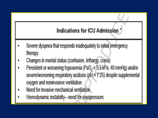1) Respiratory failure is a condition where the lungs cannot properly oxygenate the blood and remove carbon dioxide, classified as Type I (hypoxemic) or Type II (hypercapnic).