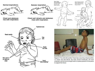 Respiratory failure in pediatrics can occur due to various intrinsic and acquired lung diseases, airway disorders, or neuromuscular dysfunction that cause insufficient oxygenation and ventilation. It is more common in children due to anatomical features such as an obligate nose breathing, small airways, and developing lung architecture. Diagnosis involves blood gas analysis showing hypoxemia and/or hypercapnia as well as imaging and microbiological testing. Management treats the underlying cause and aims to improve oxygenation initially through supplemental oxygen, airway clearance techniques, and non-invasive respiratory support like CPAP. Intubation and mechanical ventilation may be needed in severe cases.