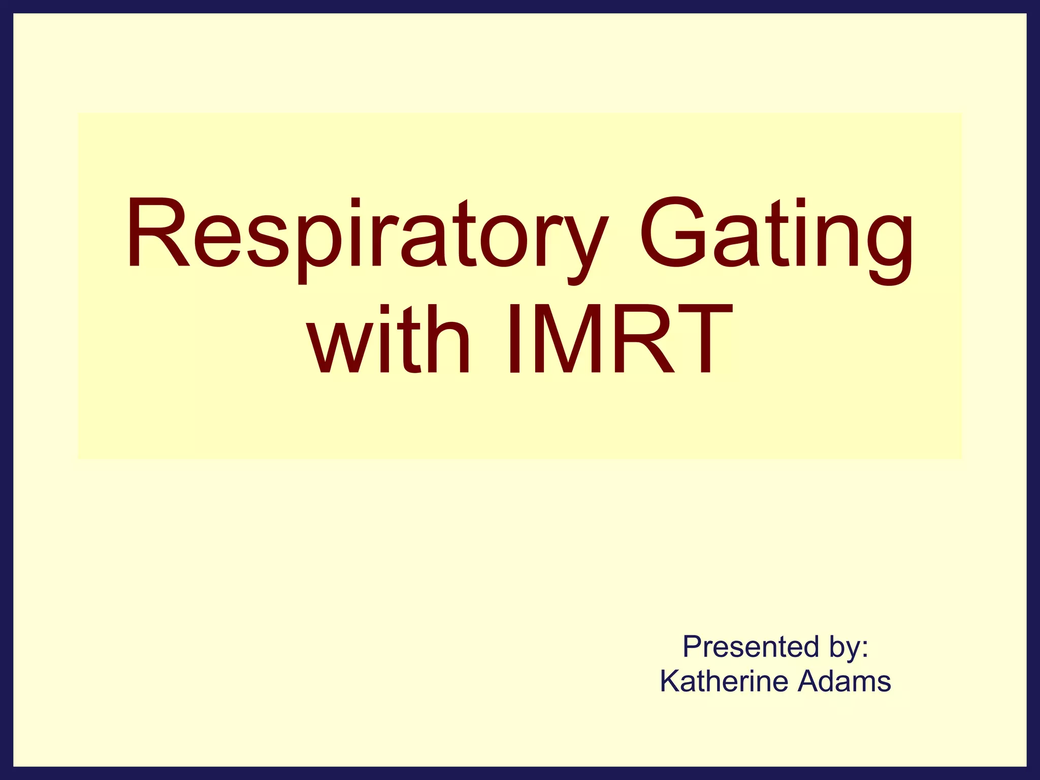 Respiratory gating with intensity-modulated radiation therapy (IMRT) allows for higher doses to be delivered to the tumor target while reducing side effects to normal tissues. It works by synchronizing beam delivery to specific phases of the respiratory cycle using external markers or internal fiducials implanted in or near the tumor. This leads to smaller planning target volumes and sharper dose gradients compared to conventional radiation therapy that does not account for tumor motion. Respiratory gating requires consistent breathing patterns from patients and continuous monitoring during treatment. It is effective for tumors in organs that move significantly during respiration like lung, liver and pancreas.