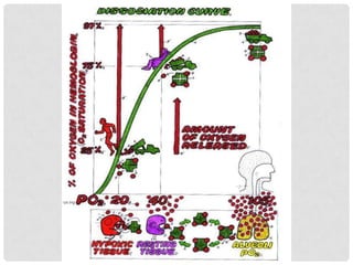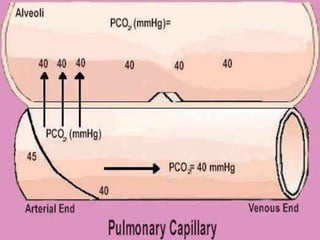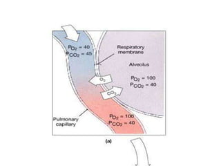 - The transport and exchange of oxygen and carbon dioxide between the lungs, bloodstream, and tissues facilitated by diffusion gradients and partial pressures. Oxygen is carried by hemoglobin in red blood cells while carbon dioxide is transported as bicarbonate ion and bound to hemoglobin.