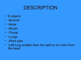 The respiratory system has 6 main organs including the lungs, windpipe, and bronchi that work together to breathe in oxygen and exhale carbon dioxide. Oxygen is breathed in through the nose or mouth and travels to the lungs, then enters the bloodstream, while carbon dioxide is exhaled out. Common problems include coughing from mucus or germs indicating a cold, which can be treated with medication.