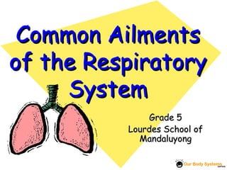 The document discusses common respiratory ailments including the common cold, sinusitis, influenza, pneumonia, bronchitis, and asthma. It provides details on the symptoms, causes, and typical treatment approaches for each ailment. For the common cold, it notes that rhinoviruses are a common cause and that treatment involves rest, fluids, and cough syrups. For sinusitis, it describes symptoms like nasal congestion and headaches and says treatment may involve antibiotics in some cases. Influenza is described as responsible for millions of illnesses annually in the US and having symptoms like fever and body aches.