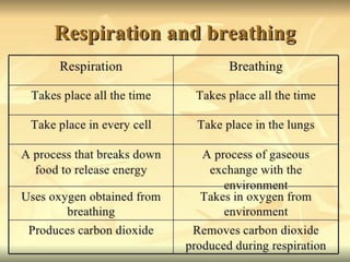 The respiratory system has an upper respiratory tract including the nasal passages, pharynx and larynx, and a lower respiratory tract including the trachea and lungs. The primary function is to supply oxygen to the blood and remove carbon dioxide. Breathing involves the diaphragm and intercostal muscles moving air in and out of the lungs. Diseases can be obstructive, restrictive, vascular, or infectious; common respiratory disorders include asthma, colds, bronchitis, emphysema and pneumonia.