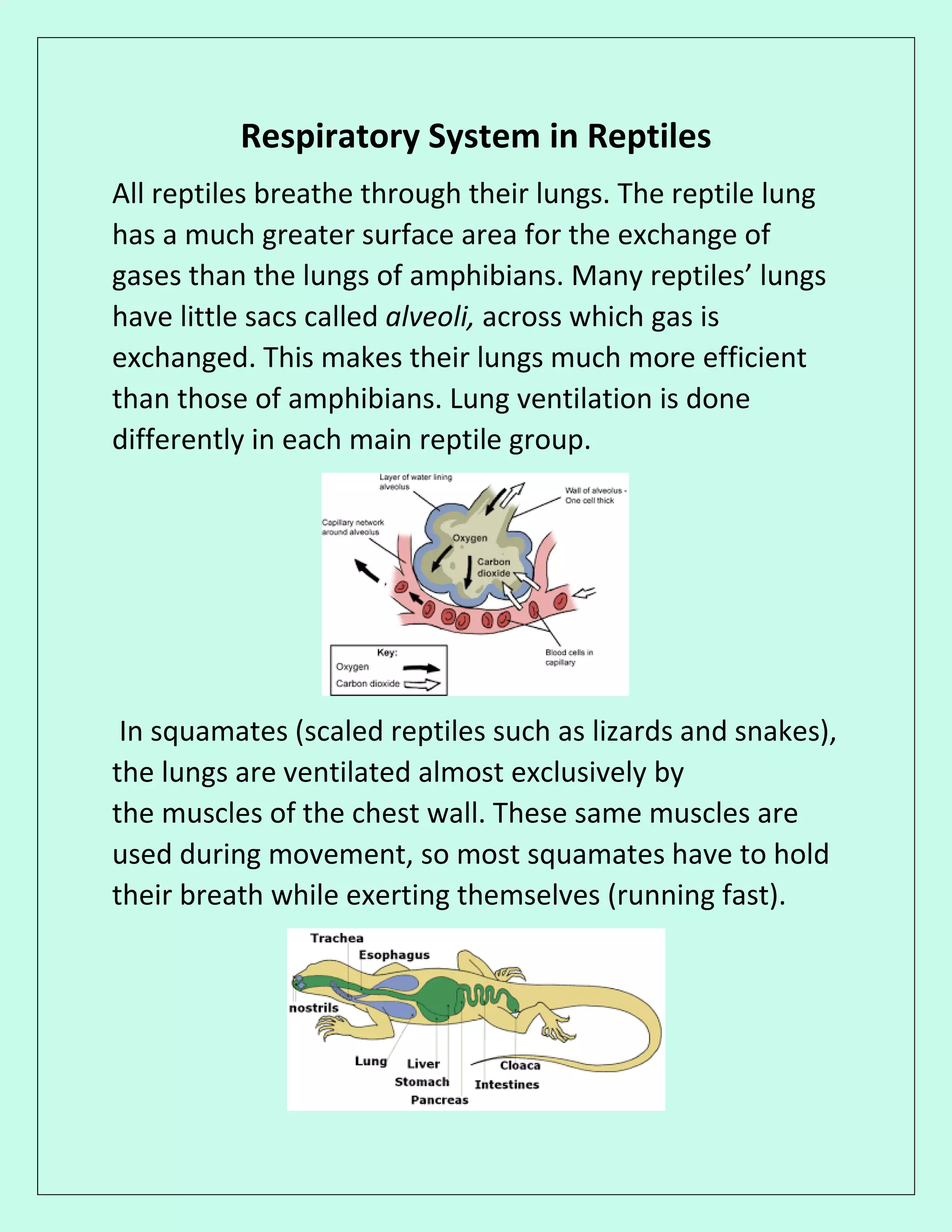 The document summarizes lung ventilation in different reptile groups. It states that while most reptiles rely solely on lung ventilation, lizards lack a diaphragm and instead use chest muscles. Some lizard species can also use throat muscles in a process called buccal pumping to force air into their lungs. In contrast, crocodilians have a muscular diaphragm similar to mammals that pulls the pelvis back to allow lung expansion during breathing.