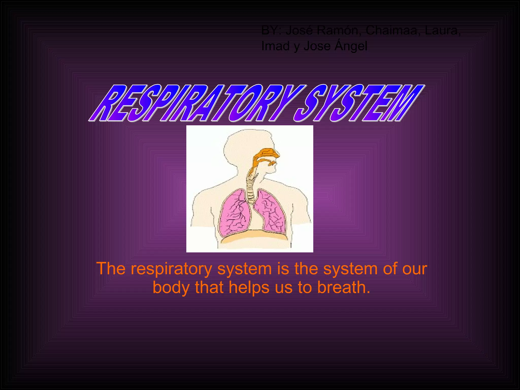 The respiratory system allows us to breathe by moving air into our nose and down into our lungs. The nose filters air as it enters, while the trachea is a tube that carries air to the lungs. In the lungs, oxygen passes into the bloodstream and carbon dioxide is released, with the diaphragm and rib cage working together to expand the lungs and draw in air.