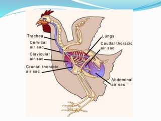 The respiratory system of poultry includes nasal openings, nasal passages, trachea, bronchi, lungs, and air sacs. It differs from mammals in that poultry have complete tracheal rings, an organ of phonation at the trachea bifurcation rather than near the pharynx, fixed non-expanding lungs, and air sacs that extend into pneumatic bones. Respiration involves inspiration through bronchi and expiration through air sacs, facilitating gas exchange through the lungs. Thermoregulation occurs via radiation, conduction, convection, and evaporation from the respiratory tract.