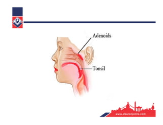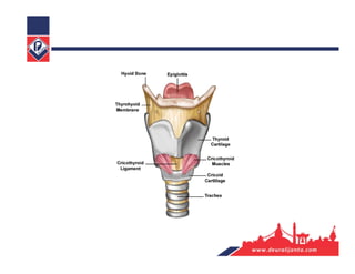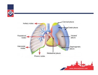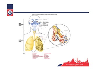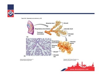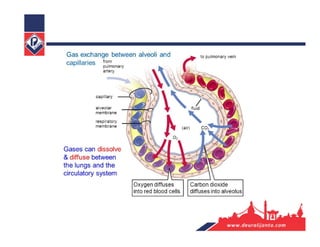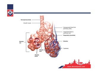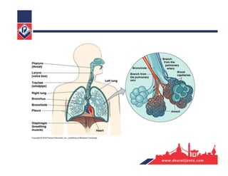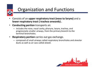 The respiratory system consists of an upper respiratory tract and lower respiratory tract. The upper tract includes the nose, nasal cavity, paranasal sinuses, and pharynx. The lower tract includes the larynx, trachea, bronchi, and lungs. The nose warms, moistens, and filters air and contains smell receptors. The lungs contain alveoli where gas exchange occurs between air in alveoli and blood in capillaries. Breathing involves inhalation that draws air into the lungs and exhalation that forces air out.