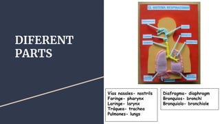 The document describes the main parts of the respiratory system and how breathing works. It lists the nostrils, pharynx, larynx, trachea, lungs, diaphragm, bronchi, and bronchioles as key parts. It explains that during inhalation, air enters through the nose or mouth and passes through the larynx, trachea, bronchi, and into the lungs, where oxygen is absorbed. During exhalation, the process occurs in reverse as carbon dioxide is expelled through the same pathways.