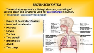 The document provides a comprehensive overview of the respiratory system, detailing its anatomy, including the organ structure from the nose to the lungs, and the functions of each component. It explains the processes of breathing (inspiration and expiration), gas exchange, and the roles of various muscles and tissues in respiratory function. Additionally, it covers the lung structure, gas transport in the bloodstream, and the nervous system's control over respiration.