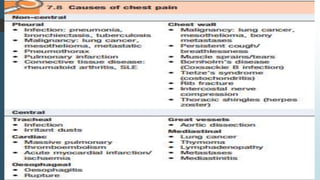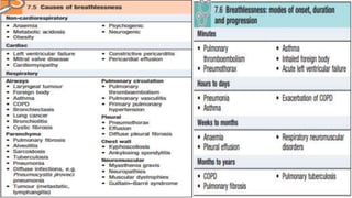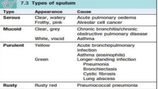 The document discusses various symptoms of the respiratory system including cough, wheezing, stridor, sputum, hemoptysis, dyspnea, and chest pain. It provides details on the causes, characteristics, and clinical significance of each symptom. Productive cough with expectoration can be caused by lower respiratory tract infections, pneumonia, tuberculosis, bronchiectasis, or lung cancer. The document also lists differential diagnoses of hemoptysis and discusses assignment topics on symptoms of the respiratory system and productive cough.