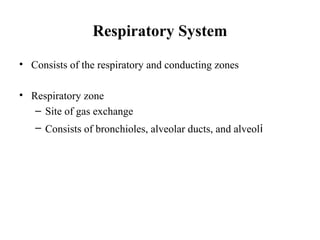 The respiratory system consists of conducting and respiratory zones. The conducting zone includes the nose, pharynx, larynx, trachea, and bronchi which warm, moisten, and transport air. The respiratory zone includes bronchioles, alveolar ducts and alveoli where gas exchange occurs. The major functions of the respiratory system are to supply oxygen to tissues and remove carbon dioxide through the processes of ventilation, gas exchange, transport, and internal respiration.