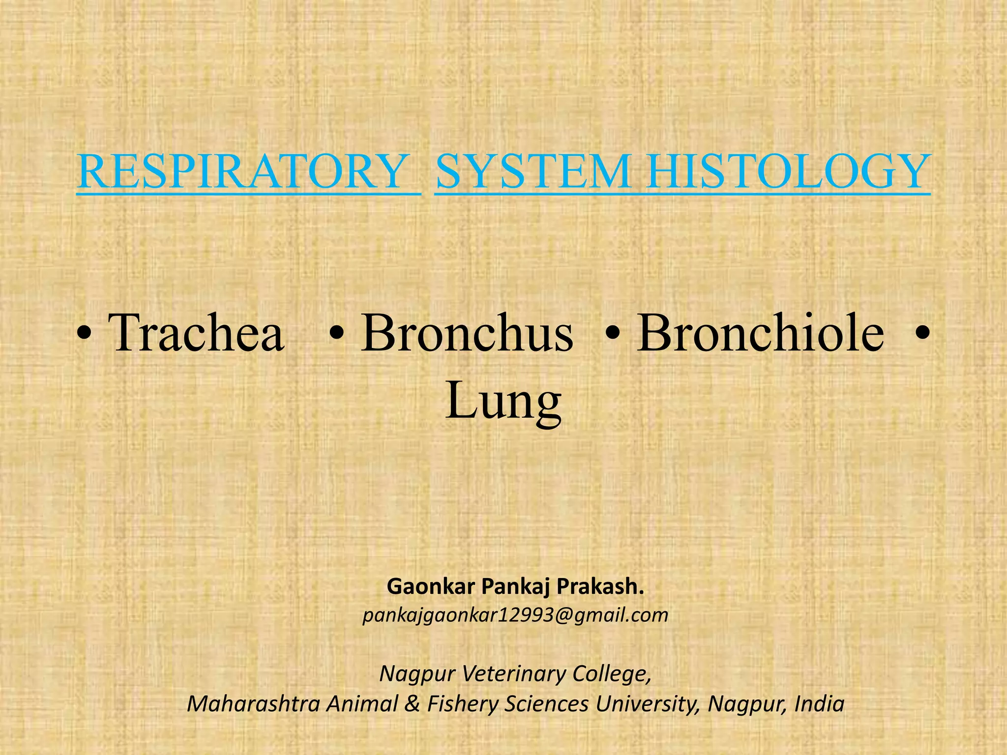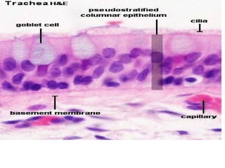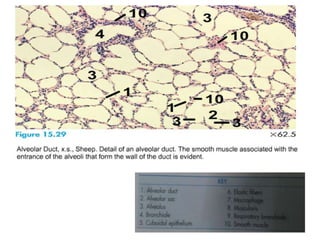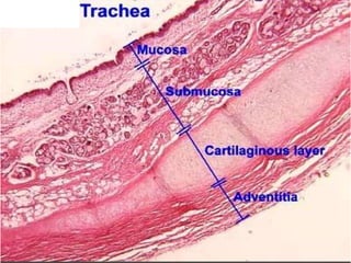 The document summarizes the histology of the respiratory system. It describes the structure of the trachea, bronchi, bronchioles, and lungs. The trachea has ciliated pseudostratified epithelium and incomplete hyaline cartilage rings. The bronchi have plates of cartilage instead of rings and a smooth muscle layer between the lamina propria and submucosa. Bronchioles lack cartilage and glands. Terminal bronchioles have Clara cells and cuboidal epithelium. Respiratory bronchioles have alveoli in their walls. The lungs contain alveolar ducts, alveoli lined with simple squamous epithelium, and macrophages in the interalveolar septa.