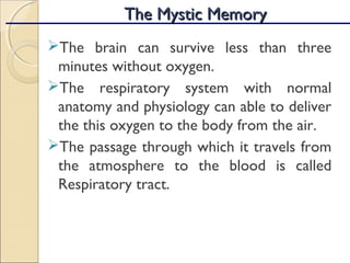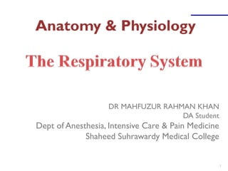 The document provides a detailed overview of the anatomy and physiology of the respiratory system, emphasizing the importance of the brain's need for oxygen and the roles of various respiratory structures. It covers the respiratory tract's divisions, mechanisms of gas exchange, and the functions of respiratory muscles involved in ventilation. Additionally, it discusses the blood supply to the lungs and the mechanics of breathing, including pressure relationships and factors influencing ventilation.