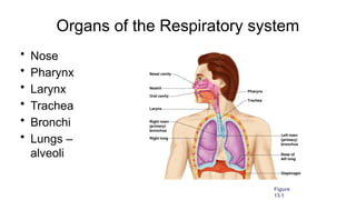 The document outlines the anatomy and function of the respiratory system, detailing the organs involved in gas exchange, including the nose, pharynx, larynx, trachea, bronchi, and lungs. It describes the mechanics of breathing, pulmonary ventilation, and the processes of external and internal respiration, as well as factors influencing respiratory rates. Additionally, it covers respiratory disorders, developmental aspects, and aging effects on the respiratory system.