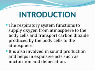 The respiratory system provides oxygen to the body and removes carbon dioxide, also playing a role in sound production and certain bodily functions. It comprises the upper and lower parts, including the nose, larynx, trachea, and lungs, each with specific anatomical features and functions. Additionally, it includes components like the paranasal sinuses and pleura, which assist in respiratory processes and airway protection.