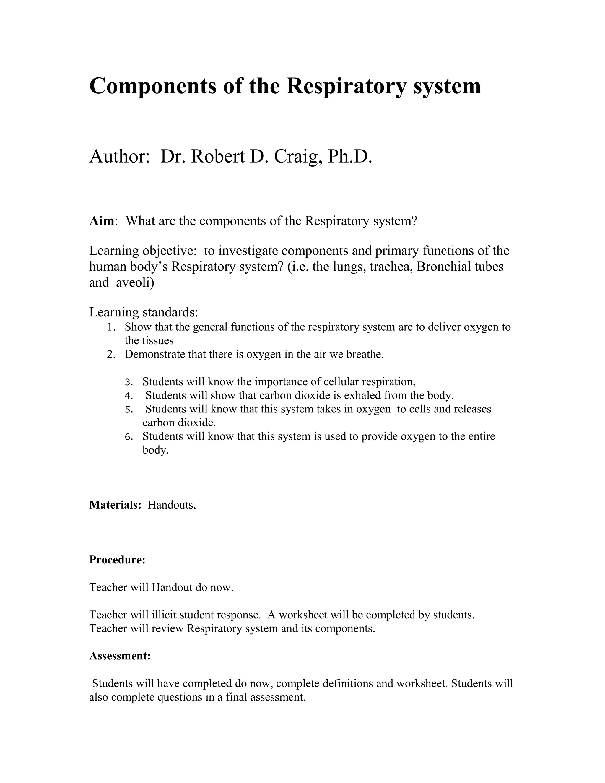 The document outlines the components and functions of the human respiratory system, emphasizing the roles of lungs, trachea, bronchial tubes, and alveoli in delivering oxygen and expelling carbon dioxide. It includes educational objectives, assessments, health concerns like asthma and bronchitis, and the impact of air pollution on respiratory health and the ecosystem. The document also provides a detailed lesson plan for teaching students about these respiratory concepts and their importance.