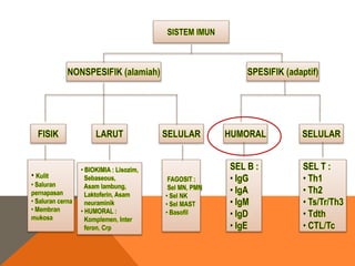 Sistem imun adalah sistem pertahanan manusia untuk melindungi tubuh dari infeksi dan serangan organisme asing seperti virus dan bakteri. Sistem imun terdiri dari sistem imun nonspesifik yang sudah ada sejak lahir dan memberikan respon langsung, serta sistem imun spesifik yang dapat mengenali dan menghancurkan benda asing berbahaya yang pernah dihadapi sebelumnya. Organ utama sistem imun adalah leukosit, makrofag, sel plasma dan sel mast.